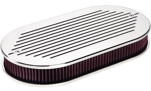 This aluminum air cleaner is ball milled with a polished top plate. Features an adjustable base to easily fit carb spacing from 6-7/16 inches to 8-7/8 inches. It includes a KandN lifetime air filter and stainless hardware. The dimensions are:: 17-1/2 inches long x 9-3/8 inches wide x 3-1/4 tall. *NOTE* WILL NOT WORK W/ DOMINATOR STYLE CARBURETOR.