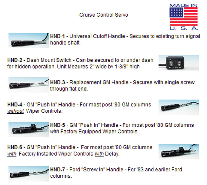 This is a cruise control unit for an electronic speedo. For vehicles with electronic speedometers or for use with Dakota Digital instruments - Includes electric servo, mounting hardware, wiring harness, and choice of control handle. Compatible with 2,000 to 40,000 pulse per mile (PPM) speed signals. (Dakota Digital instruments use 8,000 PPM signals). No vacuum needed for easy installation. Unit measures 5.5" x 4" x 3" Great for street rod. Solid state electronics for exceptional accuracy and reliability. Requires no vacuum. Works with radical camshafts and blown motors. Small, quiet and easy to install. 36 month/ 36,000 mile warranty. Electric servo cruise control for vehicles with cable driven speedometers - includes electric servo, mounting hardware, wiring harness, electric speed sensor and choice of handle (choose below). Speed sensor attaches inline with speedometer cable. Click here for cruise control instructions Click here to see installation of this unit.