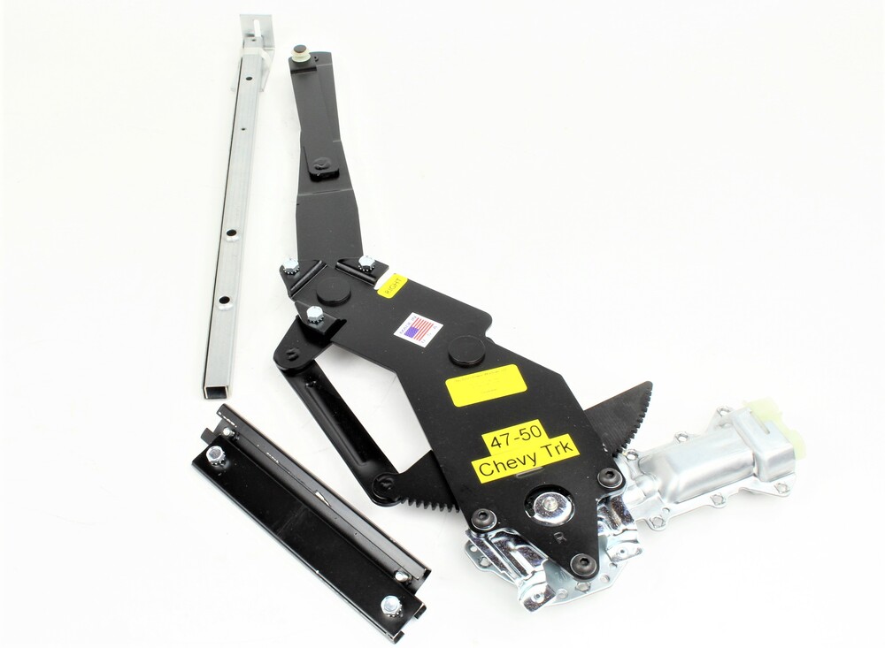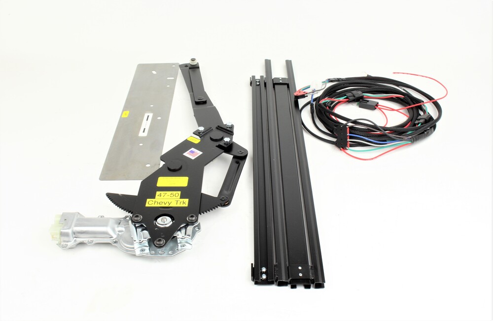 1951-54 Chevy Truck. Complete kit with chrome or black switches. Kit for vent window removal conversion. Power window conversion directly bolts into original mounting holes, 1018 cold rolled steel, brass oilite thrust bearings, gear teeth treated for long life (cryogenics), delco OEM motors. Includes delco OEM chrome or illuminated switches, conduit for wiring and carries a lifetime warranty. Must drill 2 holes for idler bar to have scissor action to keep window level. Metal template provided to locate holes. Kit Includes: Regulators/Motors Completed Wire Harness/Switches Lower Glass Channels Front Vertical Channels Idler Bars - 6-1/2" Conduit for Doors - Adel Clips Metal template Instructions Packet Special Instructions 3 Glass Pattern Instructions Front Vertical Channel Instructions